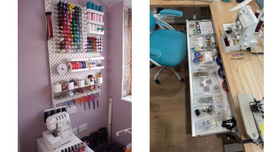 - Вертикальное хранение. Пегборды (настенные доски с отверстиями) — это находка. Нитки, ножницы, лекала — всё перед глазами, но не занимает место на столе.